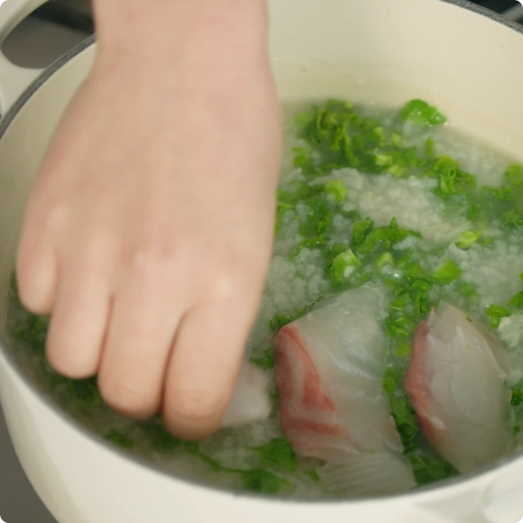 - 火を止めて塩と菜の花を加えて混ぜ、真鯛のスライスをのせてフタをし、3分ほど余熱で火を入れる。