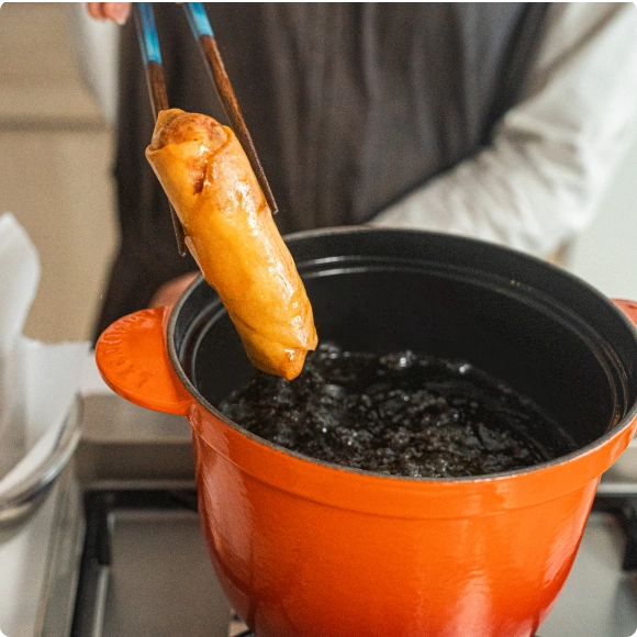 煮込みも、揚げ物も。ひとつの鍋で、料理の幅は広がる。ル・クルーゼの頼もしさを日々実感しているという五十嵐さんが選ぶもう一品は自身もよく作る春巻き。 もともと春巻きは、春の食材を包む縁起物として中国で親しまれてきた料理。「春巻きは、何を巻いてもおいしくて、それぞれが自由に楽しめるところが好きです。食べる人の幸せを願う食べものが、国を越えて、今では自由な料理として親しまれている。それがとても素敵だと思いました」では、春巻きを五十嵐さん流に仕上げるには?「春巻きは、海鮮やお肉など、“ひとつでもうれしくなる食材”が入っていると、ぐっと特別な一品になります。」具材は、ごぼうやれんこん、切り干し大根など、水分の少ないものを組み合わせるのがポイント。揚げ油には、ほんのり甘く香るこめ油がおすすめ。