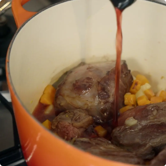 - 1.の鍋に2.の牛すね肉、黒こしょう、トマトペーストを入れ、赤ワインを肉が半分浸る程度まで注ぐ。フタをして中火にかけ、ふつふつと煮立ったら肉がかぶるくらいまで水を足す。