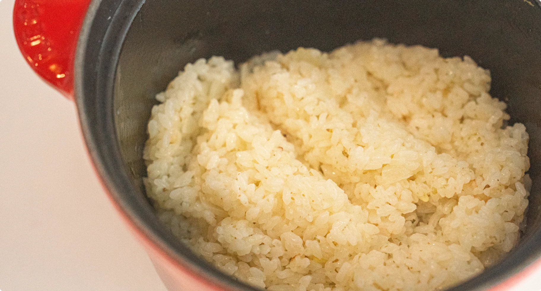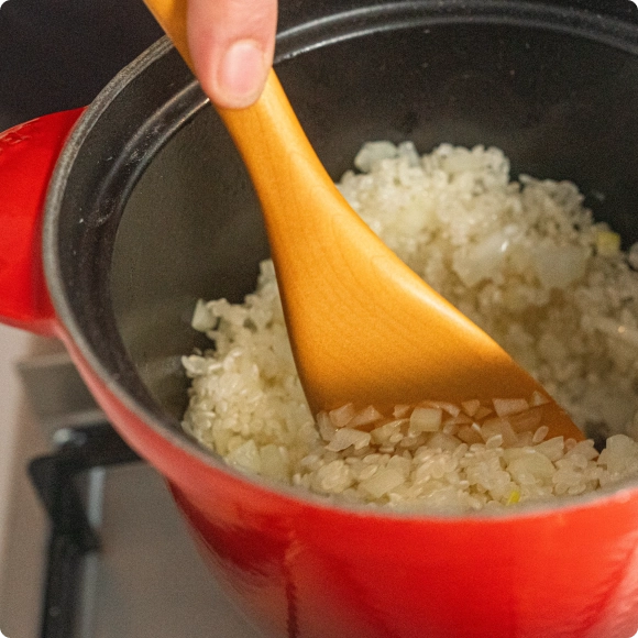 「北イタリアでは、よく煮込み料理にライスを添えて食べているんです」熱伝導が高く、短時間で炊けるル・クルーゼを使えば、そんな一皿も気負わず作れるという。「白ワインを少し入れると、香りが立ってより本格的に。バターはあと入れがコツ。香りが立ちやすく、焦げにくくなるんです」シンプルな白米も、ひと工夫で、煮込みと合わせても引けを取らない主役級の一皿が完成する。「バターライスは、昔から食卓にあって、料理を引き立てながらもしっかりおいしい。ル・クルーゼのようにずっと変わらず愛されてきたものだから、“100年レシピ”に選びました」