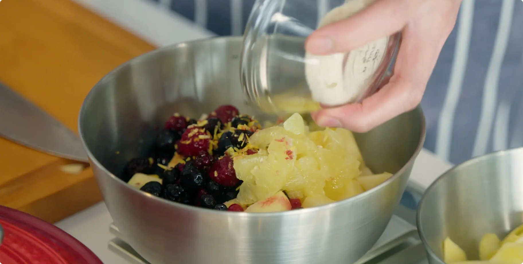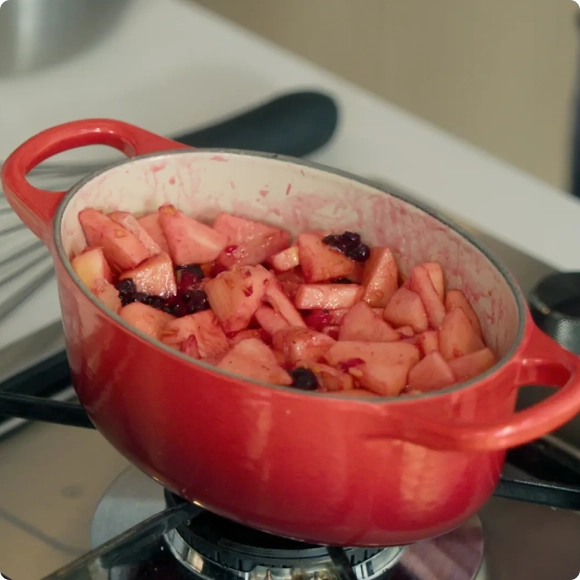 - 鍋にりんご、ベリー、レモンの皮と果肉、きび砂糖を入れ軽く混ぜ合わせる。中火で加熱し、果汁が出て全体がくたっとするまで煮る。果物がやわらかくなったら火を止める。