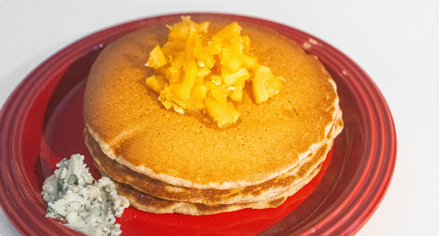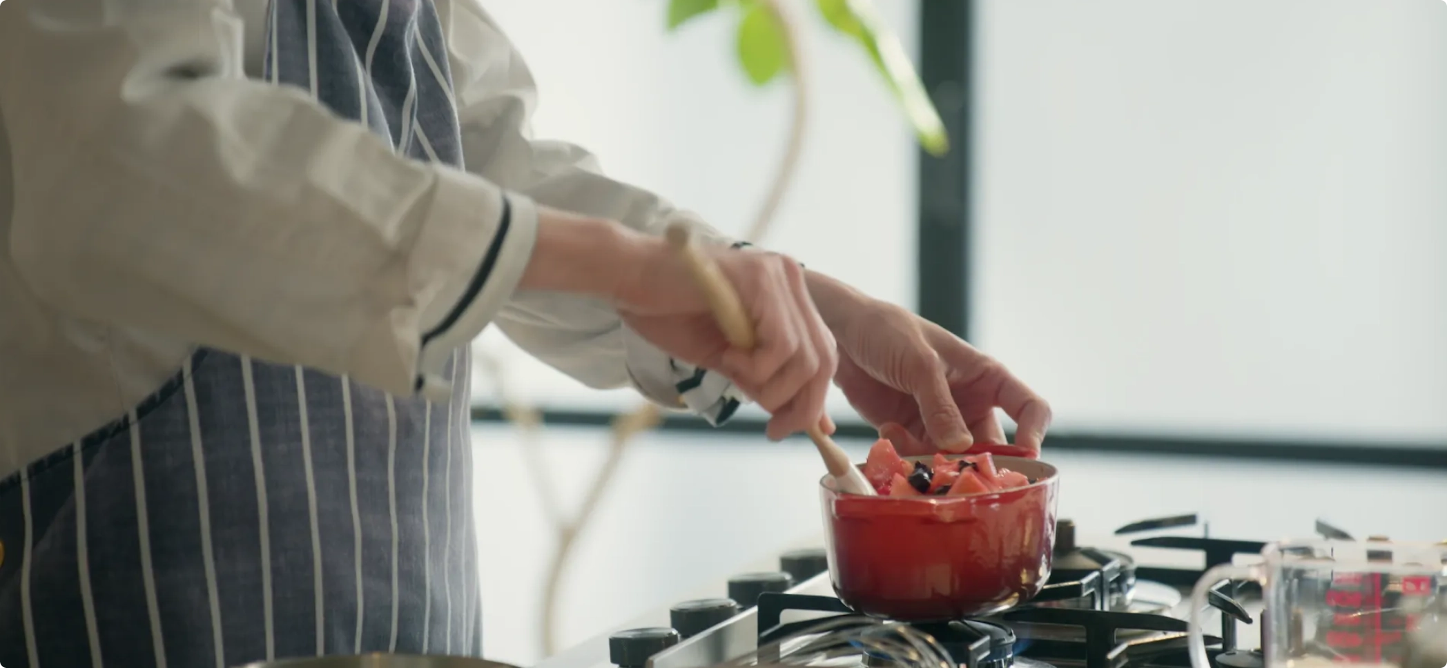 「ル・クルーゼのフライパンは、パンケーキを焼くにもぴったり」と話す嶋崎さん。ふっくらとした焼き色に仕上がり、朝の台所が少しうれしくなる。「イギリスは食文化が本当に面白くて、行くたびに新しい発見があるんです」今回のチャツネも、そんな旅の記憶から。一般的にカレーに添えることの多いチャツネだが、 パンケーキやサンドイッチ、チーズと合わせるのが現地流。中でもブルーチーズと合わせる食べ方はお気に入りだそう。「パンケーキは、小さい頃から家族で囲んで食べていた、あたたかな記憶のある料理なんです。せっかくなら、ル・クルーゼで作ったチャツネを添えて、特別な食卓にしたい。そんなふうに、日常を少しだけ豊かにしてくれる料理を、これからも大事にしていきたいと思いました」