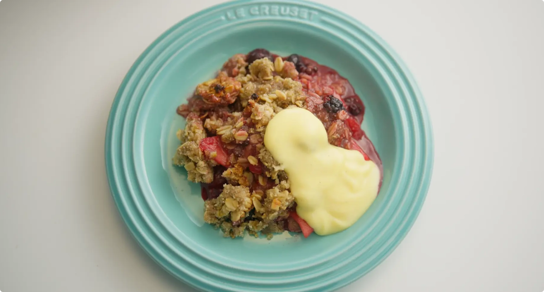 - 焼き上がったクランブルを器に盛り、温かいうちにカスタードをかける。