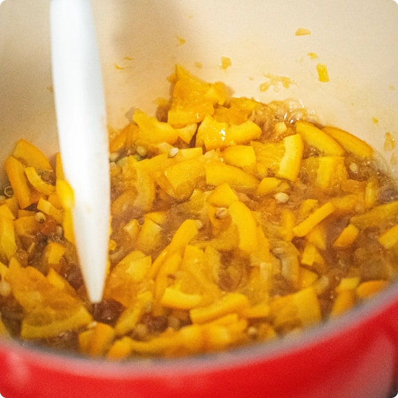 鍋にオレンジと水を入れ、皮がやわらかくなるまで中火で5分ほど煮る。(A)を加え、さらに15分ほど煮る。