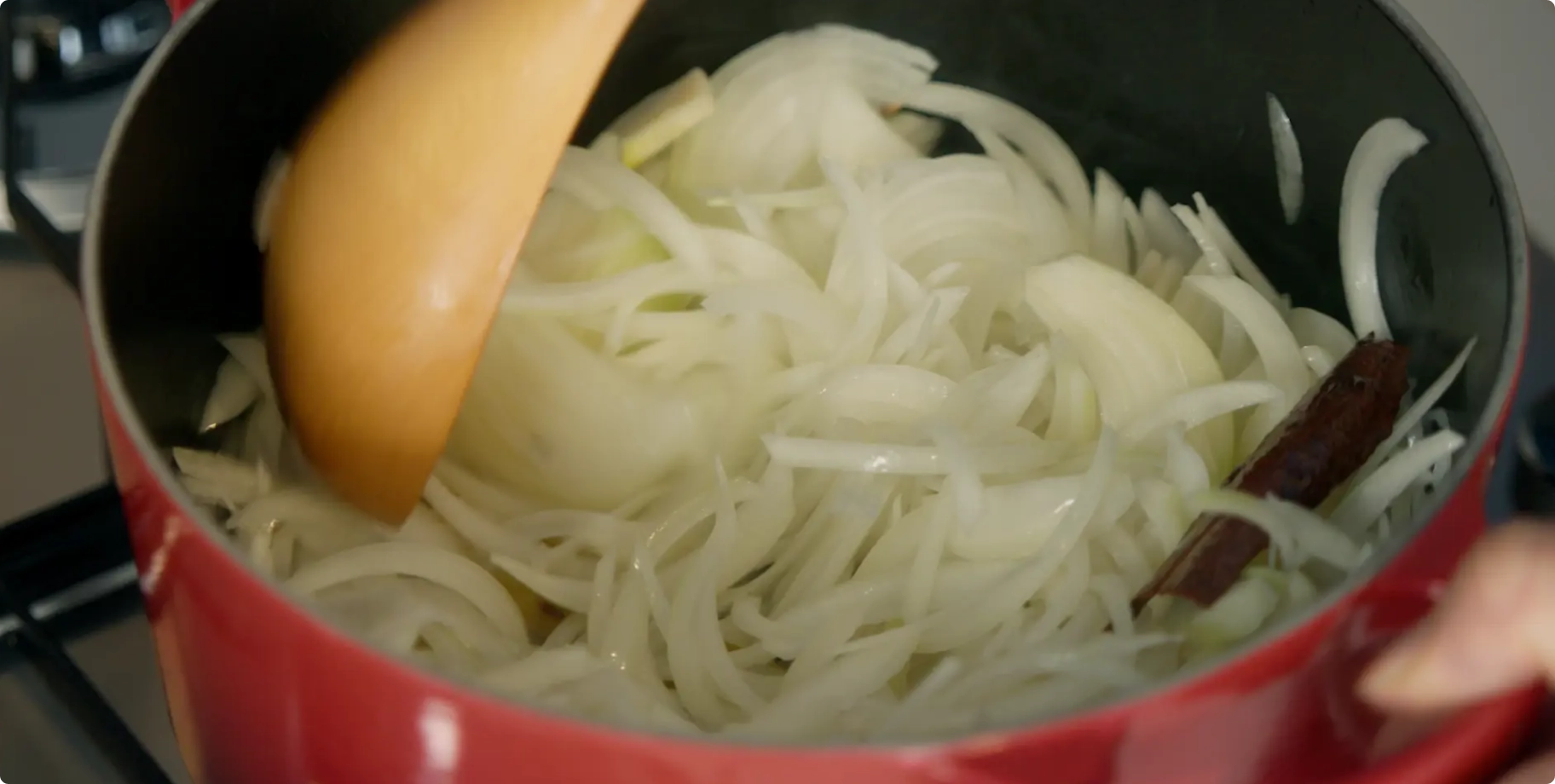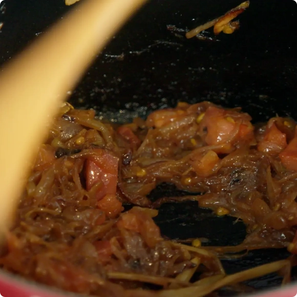 ※クミンシードとカレーリーフは焦げやすいため、手早く炒める。 - 3.に玉ねぎを加えてしんなりするまで炒める。にんにくとしょうがを加え、中火で10~15分ほどかけてあめ色になるまで炒める。さらにトマトを加え、水分が飛ぶまで10分ほど炒める。