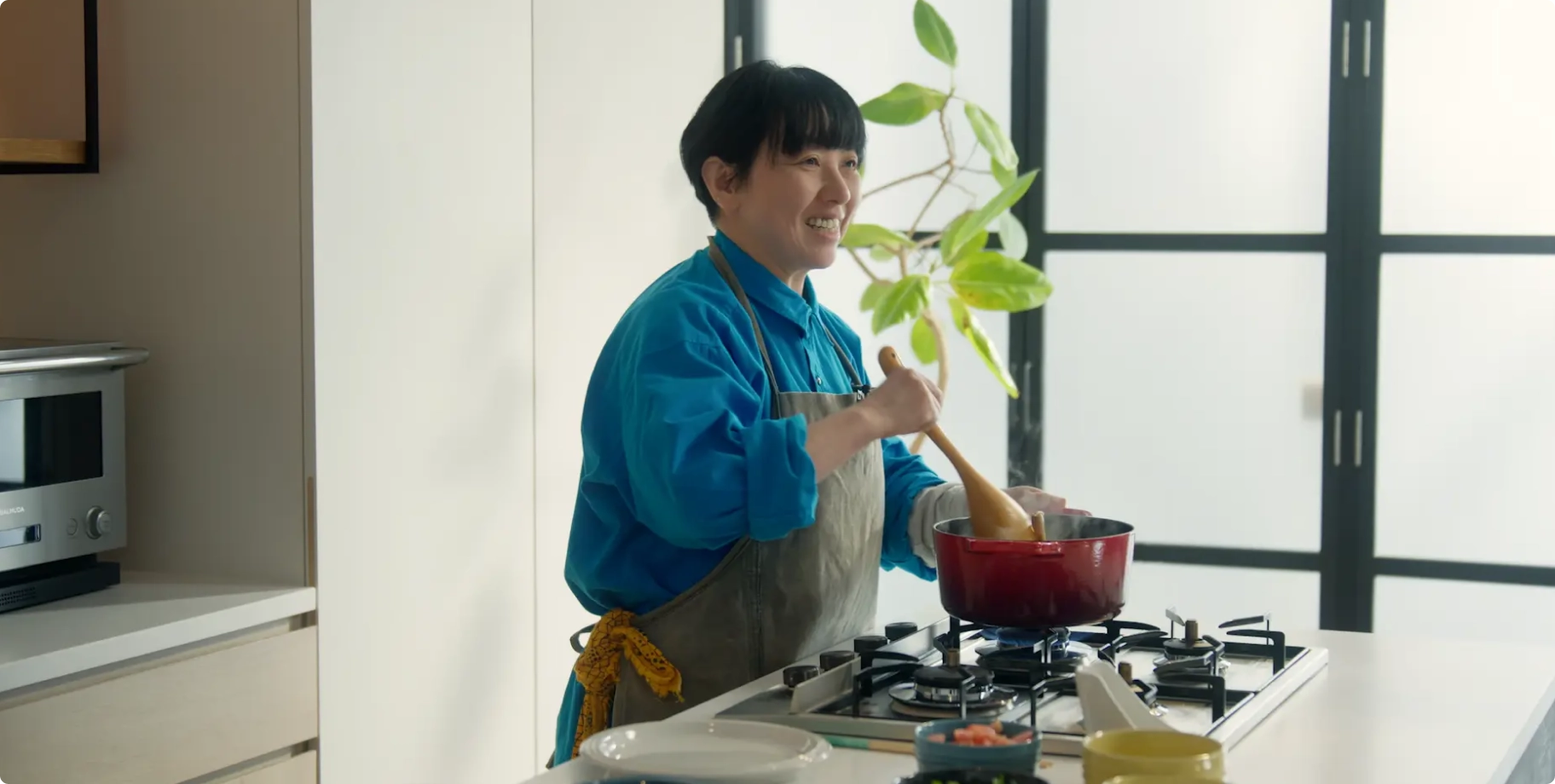 竹林久仁子さんが料理に興味を持ち始めた20代。ル・クルーゼは「いつか使ってみたい」という憧れの道具だった。最初に選んだのはオレンジの鍋。「台所にあるだけで、“料理が完成した”って思えたんですよね」と振り返る。火にかけるだけでなく、オーブン調理にも使えると知ってからは、少しずつ手の込んだ料理にも挑戦するように。「使うたびに、もっと丁寧に、もっとおいしく」ーー。そんな思いから、いつしか食材の選び方や調理のプロセスにも、自分なりのこだわりが生まれていった。「ル・クルーゼは、素材にきちんと向き合えば、腕に自信がなくてもおいしく仕上げてくれるんです」。だからこそ、いい道具を選ぶことの意味を、もっと多くの人に知ってもらいたいと語る。