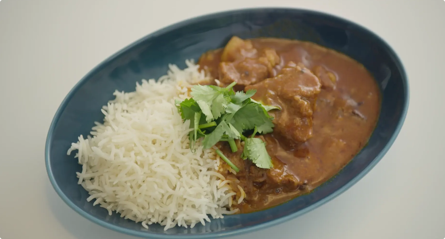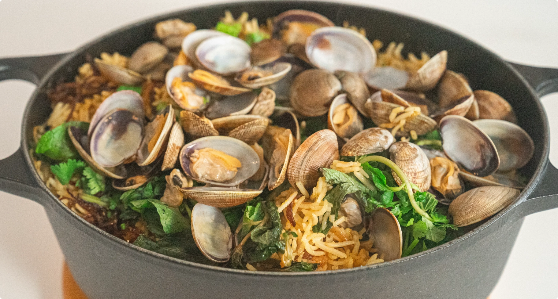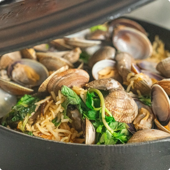ル・クルーゼの鋳物ホーロー鍋は、ビリヤニのような蒸し料理でもその力を発揮する。「“これが得意”というより、“何でも得意”って言いたくなる鍋。最初は高価に感じるかもしれないけど、そのぶん自然と丁寧に使いたくなるんですよ」と竹林さん。あさりの旨みを含んだグレイビーソースに、炊きたてのバスマティライス。層を重ねてじっくり蒸し上げることで、スパイスの香りがふわりと広がる、出汁の効いた香り高い一皿が完成する。