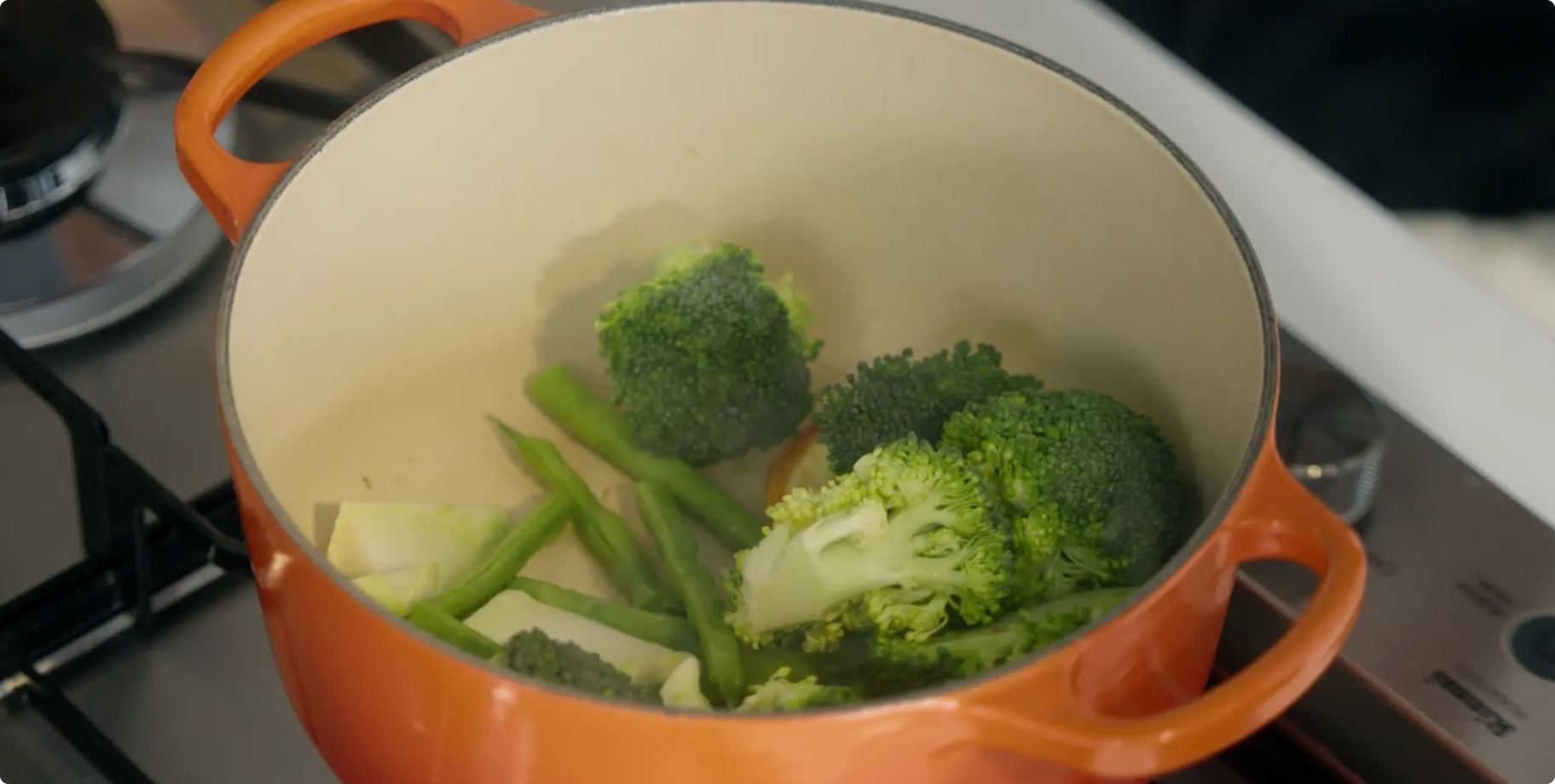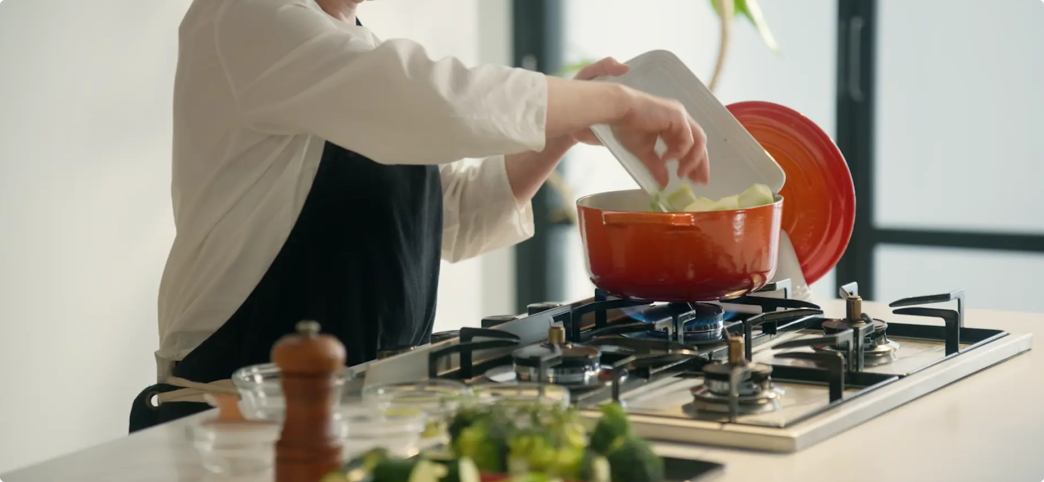 「ル・クルーゼは、食材の水分を活かす構造なんです」と話す平野さん。水が貴重だったフランスには、素材が持つ水分そのものを活かして調理する知恵が根付いている。「完全密閉ではなく、少しずつ蒸気が抜けることで肉や野菜にやさしく火が入るんです」オイルと塩、野菜が渾然一体となり、素材本来の旨みがじっくりと濃縮されていく。この繊細なスチームコントロールが、料理の仕上がりに確かな違いをもたらしてくれる。