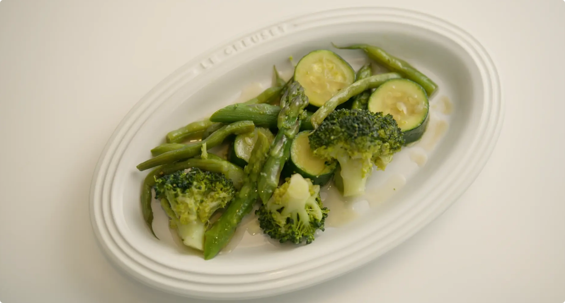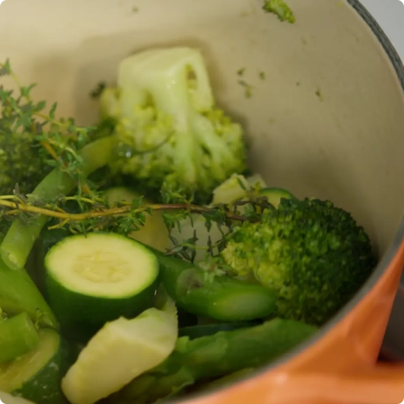 少量のオイルと塩で蒸し煮にする「エチュベ」は、素材の水分を活かすフランスの技法。フタはなるべく開けず、ついた水滴も旨みとして鍋に戻すのがポイント。野菜一種でも十分おいしい仕上がりに。