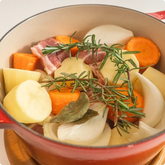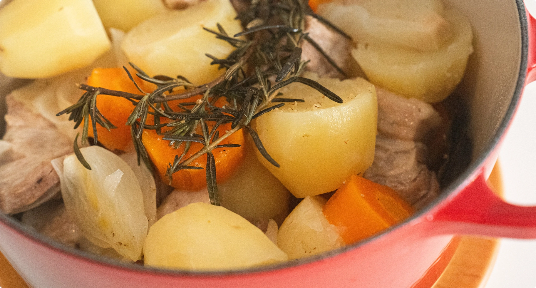 - 鍋に玉ねぎ、じゃがいも、にんじんを全体の半量入れ、にんにく、豚肉をのせ、こしょうを振る。残りの野菜、ローリエ、ローズマリーを重ねる。