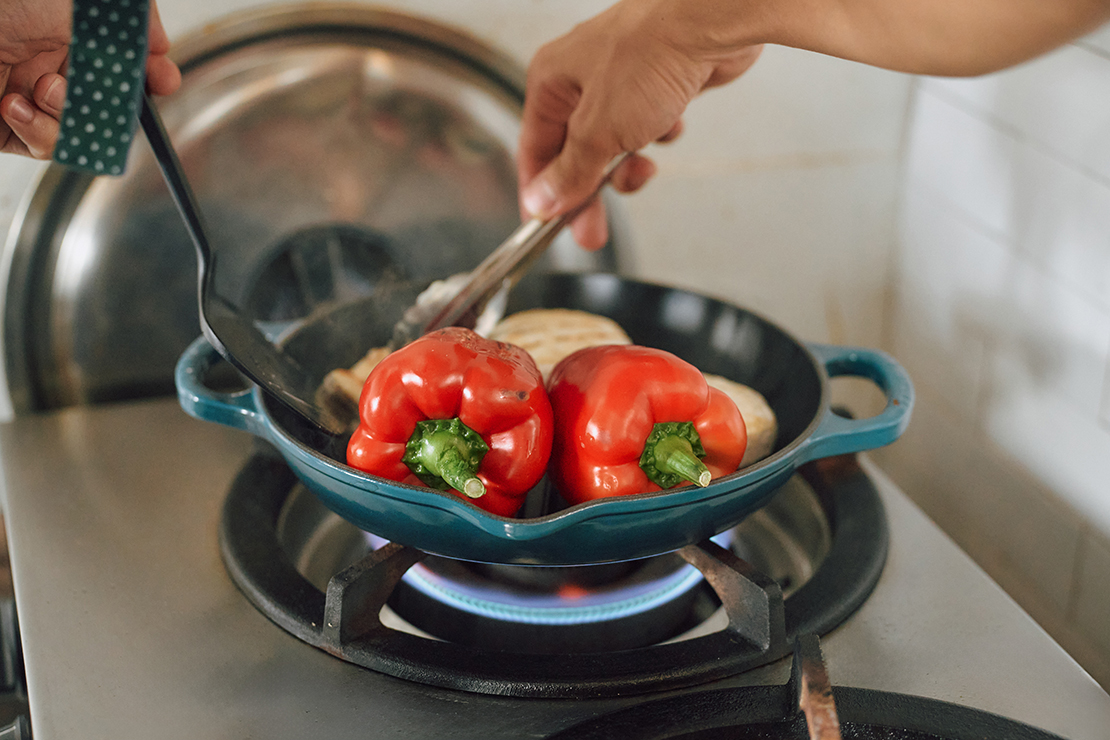 「ル・クルーゼのグリルはグリル面が波形状になっているので、余分な油を落としやすい。それとやっぱり短時間で火が均一に入ること、おいしそうな焼き目がつくところがうれしいです。お肉はグリルに入れたら、あまり動かさないことです。そうすることでおいしい焼き色がつきますから」
