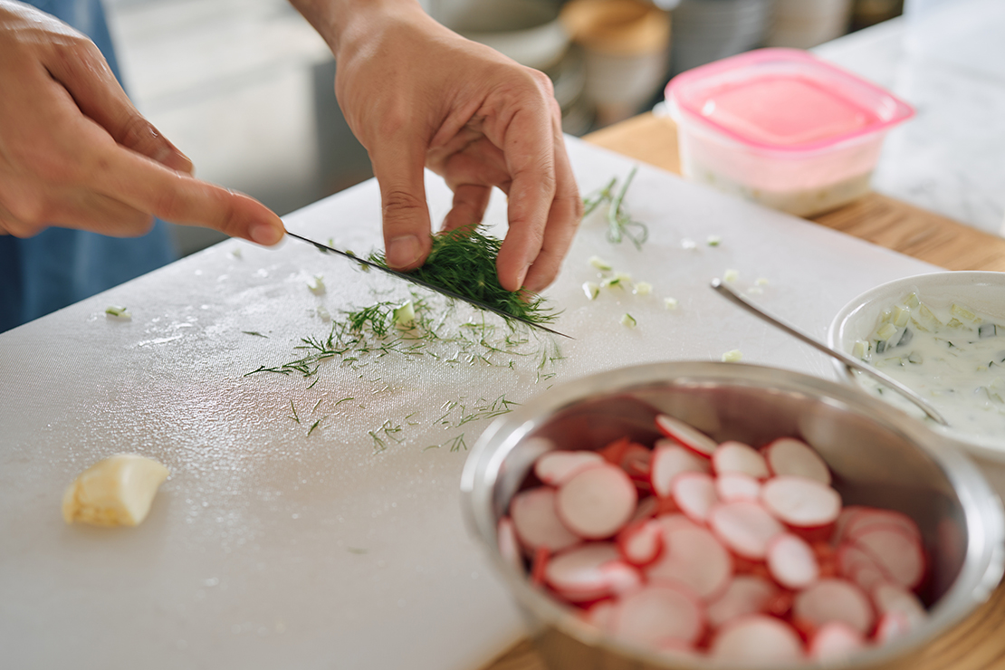 - すりおろしたニンニクと★を混ぜ合わせて、刻んだディルときゅうりを加える。