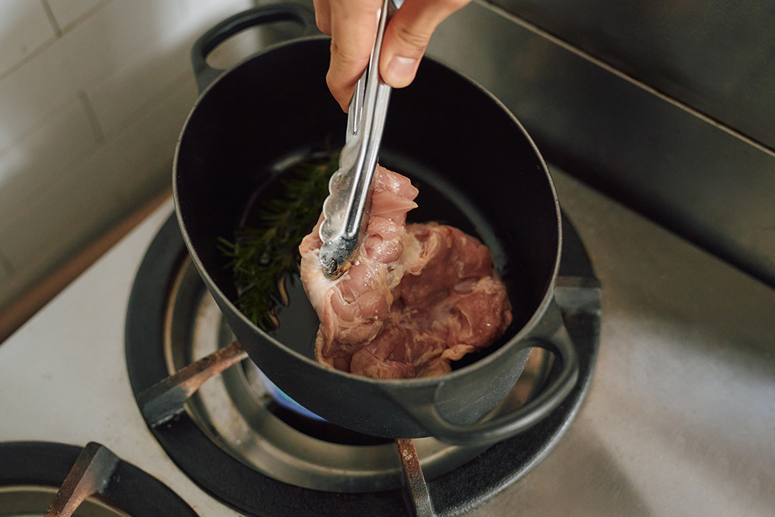 - 鍋にオリーブオイルと半分に切ったニンニク、ローズマリーを入れて、弱火で加熱する。茶色くなったらニンニクを取り出し、中火に。