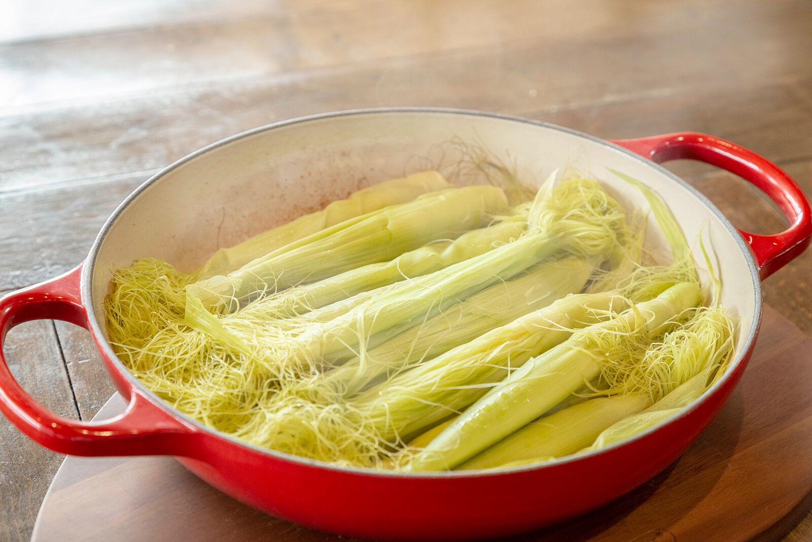 いつもの野菜料理をよりおいしくしたいなら、ぜひル・クルーゼで玉ねぎやセロリ、にんじんなどを煮込んで「野菜だし(ブロード)」を作ってみてください。野菜の優しいうまみと香りたっぷりの万能だしで、「少し料理に水分を足したい」「味にもう少しコクと香りが欲しい」というときに便利です。私はパスタソースの仕上げで、水分量を調整したいときなどにもよく使っています。