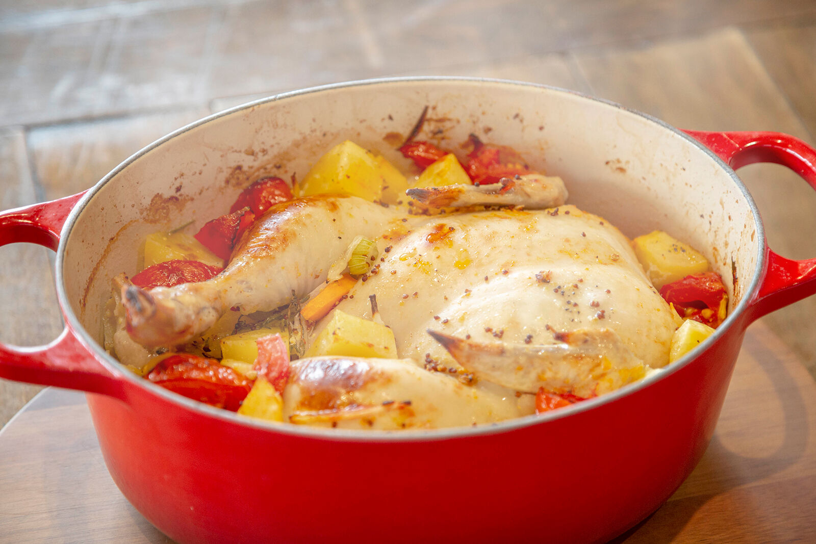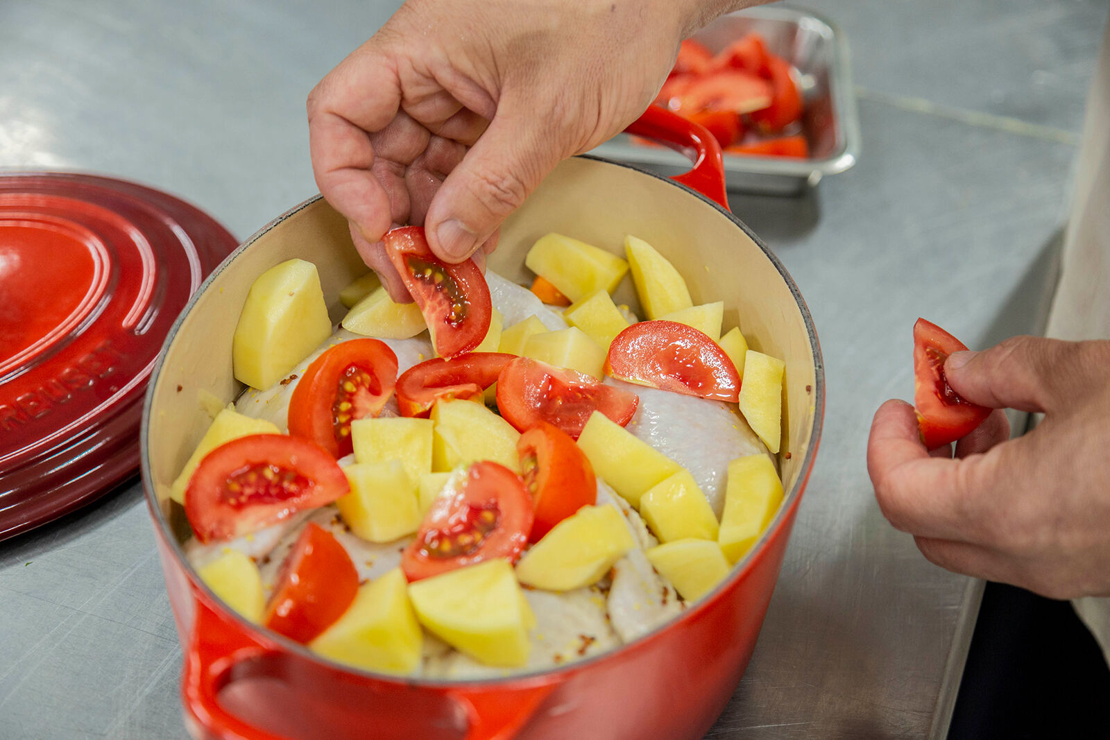 - 鍋に丸鶏をマリネ液ごと移し、上にじゃがいもとトマトを並べる。