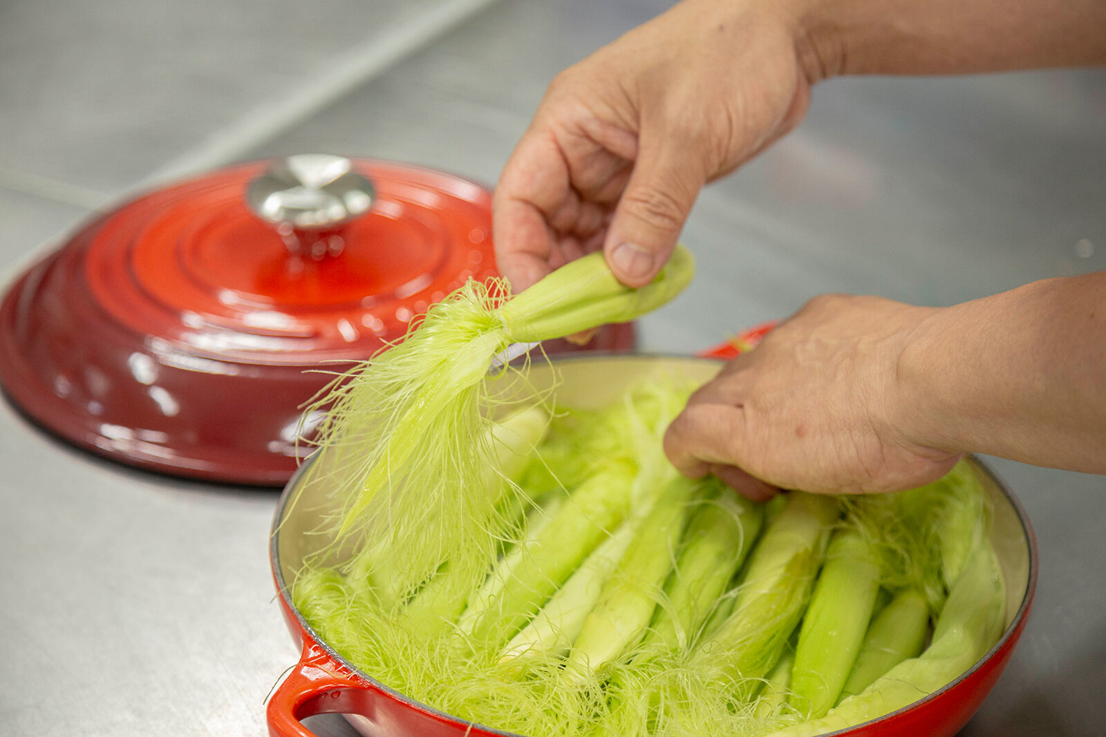 田中シェフ:野菜には、「採れたてのおいしさ」と「調理によって引き出されるおいしさ」の2つがあると思っています。採れたての野菜にはシャキシャキとした食感やみずみずしさ、その野菜ならではの香りを味わう楽しみがありますし、調理した野菜は、熱や調味料を加えることによって引き出される「うまみ」がおいしいとしみじみ思います。だから、調理するときは野菜本来の食感や香りをできるだけ活かしつつ、うまみを引き出すような調理をするように心がけています。その点、ル・クルーゼは野菜料理との相性がすごく良いと思います。ムラなく熱が入るので煮崩れしませんし、蒸気が鍋の中で循環するので水をあまり加えずに調理でき、野菜のうま味が凝縮されるところが気に入っています。それに、ル・クルーゼを使ったことのある方にはわかってもらえると思うのですが、キッチンでル・クルーゼを手にすると、「さぁ、おいしい料理を作って喜んでもらおう」っていうスイッチが入る気がするんですよね(笑)。おいしい食を通じて、食べる人の笑顔や健康を願う気持ちは、カゴメの企業としての原点でもあるので、その意味でル・クルーゼとカゴメには相通ずるものがあると感じています。