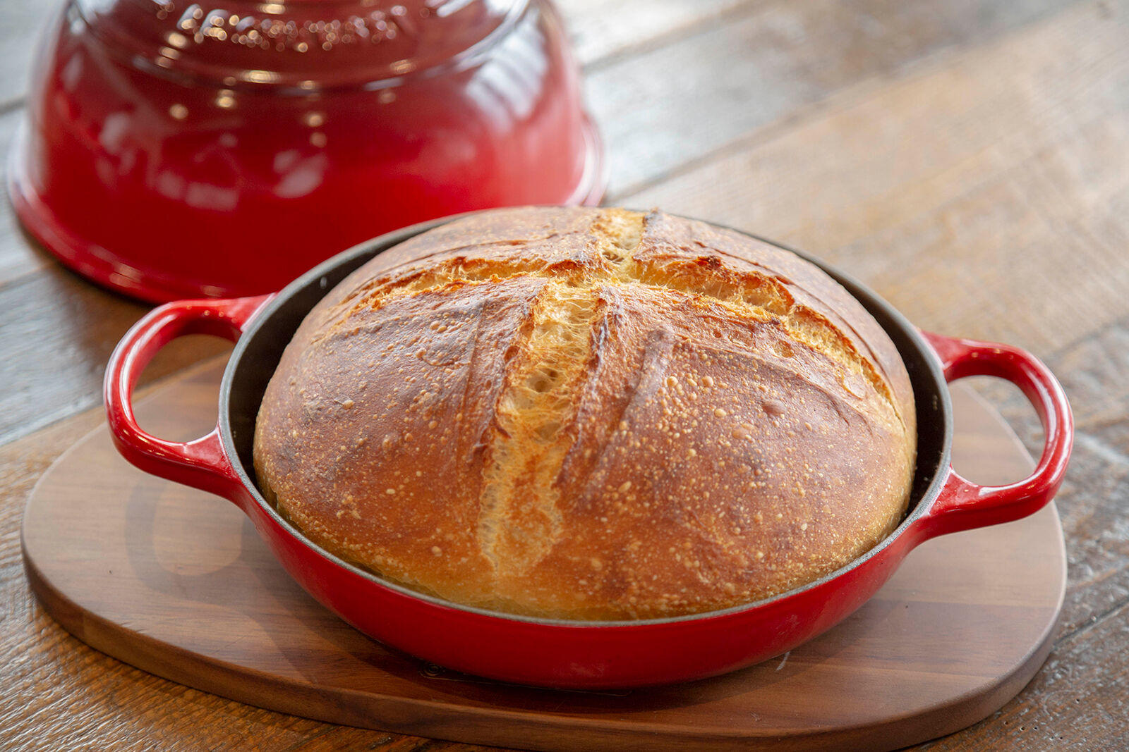 IL FAGGIOの看板料理・ナポリピザはピザ生地からお店で手作りしたものですが、防腐剤を使っていないピザ生地は日持ちしないため、余ってしまうと処分せざるを得なくなってしまいます。そこで、田中シェフが考案したのは、ピザ生地を再度発酵させて焼き上げるオリジナルパン。パンにすると焼いた日から数日間はおいしく食べることができるので、せっかくのピザ生地を無駄にすることはありません。この日はル・クルーゼの「シグニチャー ブレッド・オーブン」で、ピザ生地のオリジナルパンを焼いてみてもらいました。ル・クルーゼならではのドームエフェクト(鍋の中で水蒸気と熱が循環し、ムラなく加熱する効果)で、中はしっとり外はパリパリのおいしそうな焼き上がり!ちょっとした工夫でおいしくフードロスを削減する素敵な習慣、私たちも、ぜひ生活に取り入れたいものですね。