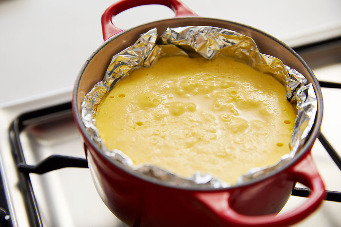 - 5に3の生地を流し入れ、鍋とアルミ箔の隙間から水100mlを入れてフタをし、ごく弱火で30~35分ほど蒸し焼きにする(途中ふつふつとしてきたら一度フタを外してください。中心が少し盛り上がっていればOK)。