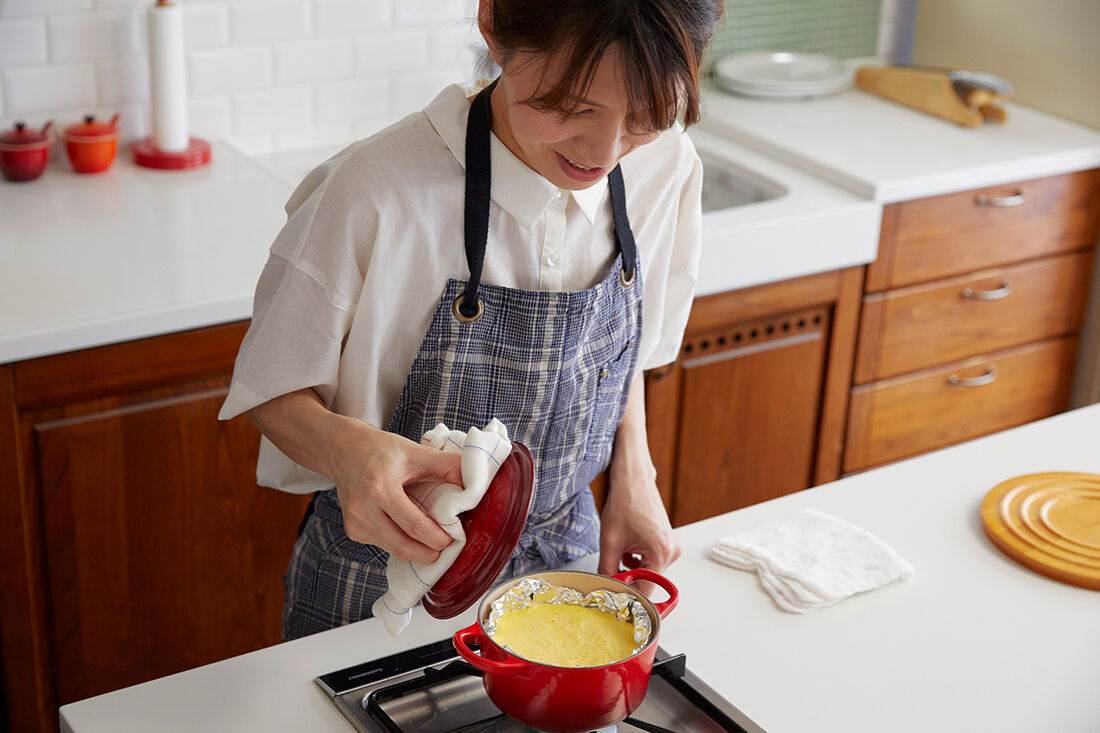 - 気密性、熱伝導率の高いル・クルーゼの鍋に水を入れて蒸し焼きにすることで、オーブンで焼くよりもなめらかでしっとり仕上がります。