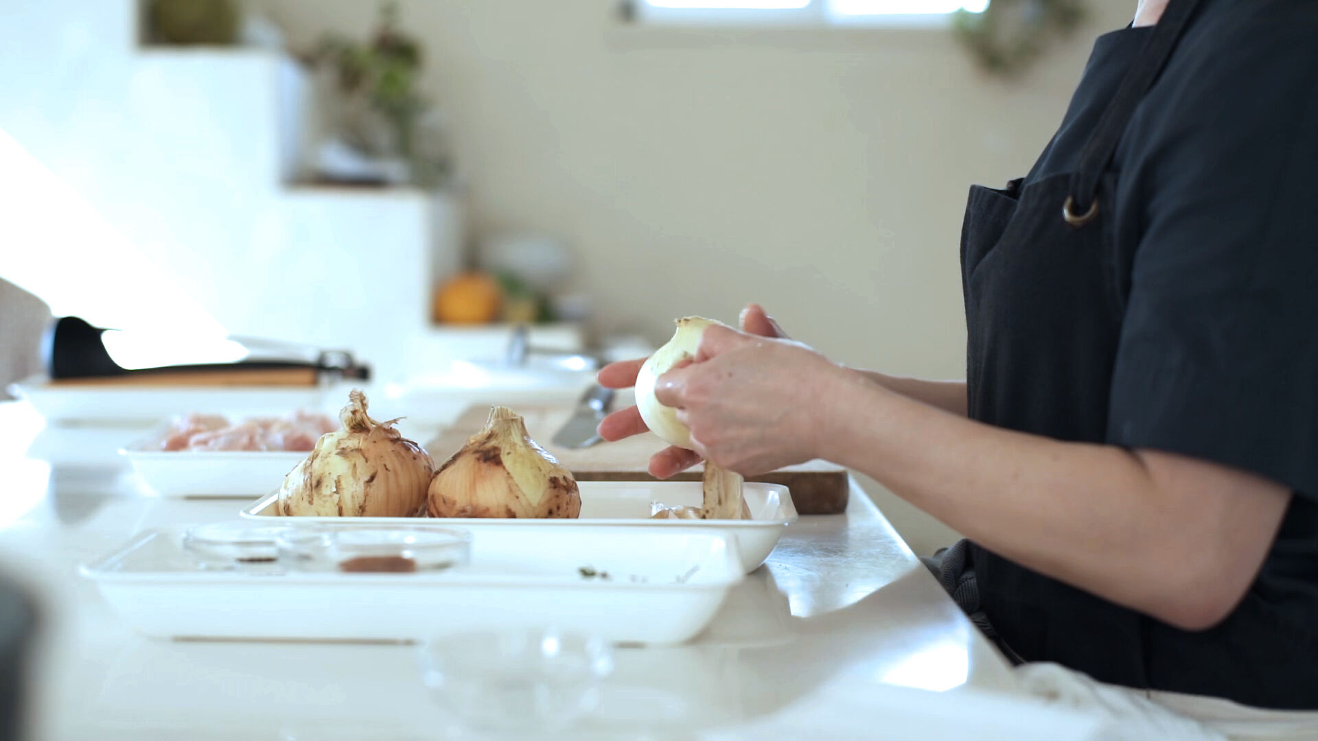 - 新玉ねぎは旬の今だからこそ、丸ごと煮て、そのうまみを味わうレシピに。玉ねぎの皮にはポリフェノールが多く含まれ、カルシウム、マグネシウムも皮と皮の近くに集まっているため、このレシピでは玉ねぎの皮も使ってスープをとる。