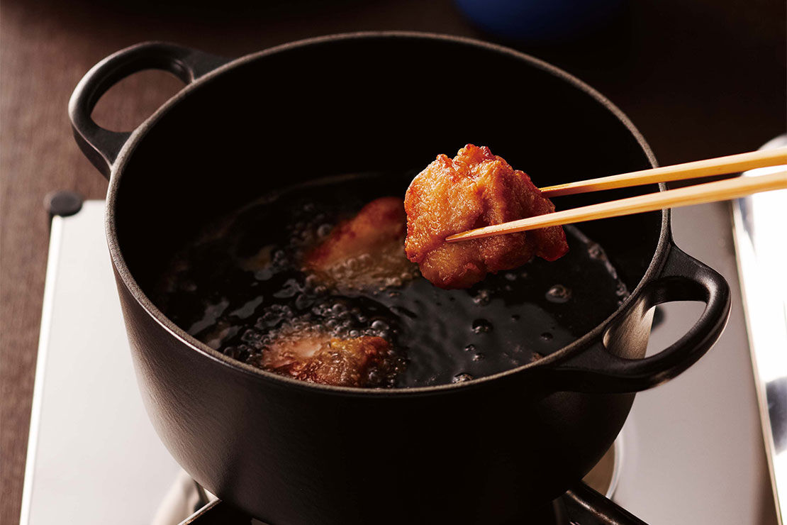 ホーム > ル・クルーゼで作るレシピ > 若鶏の唐揚げ ピリ辛ねぎダレ添え
