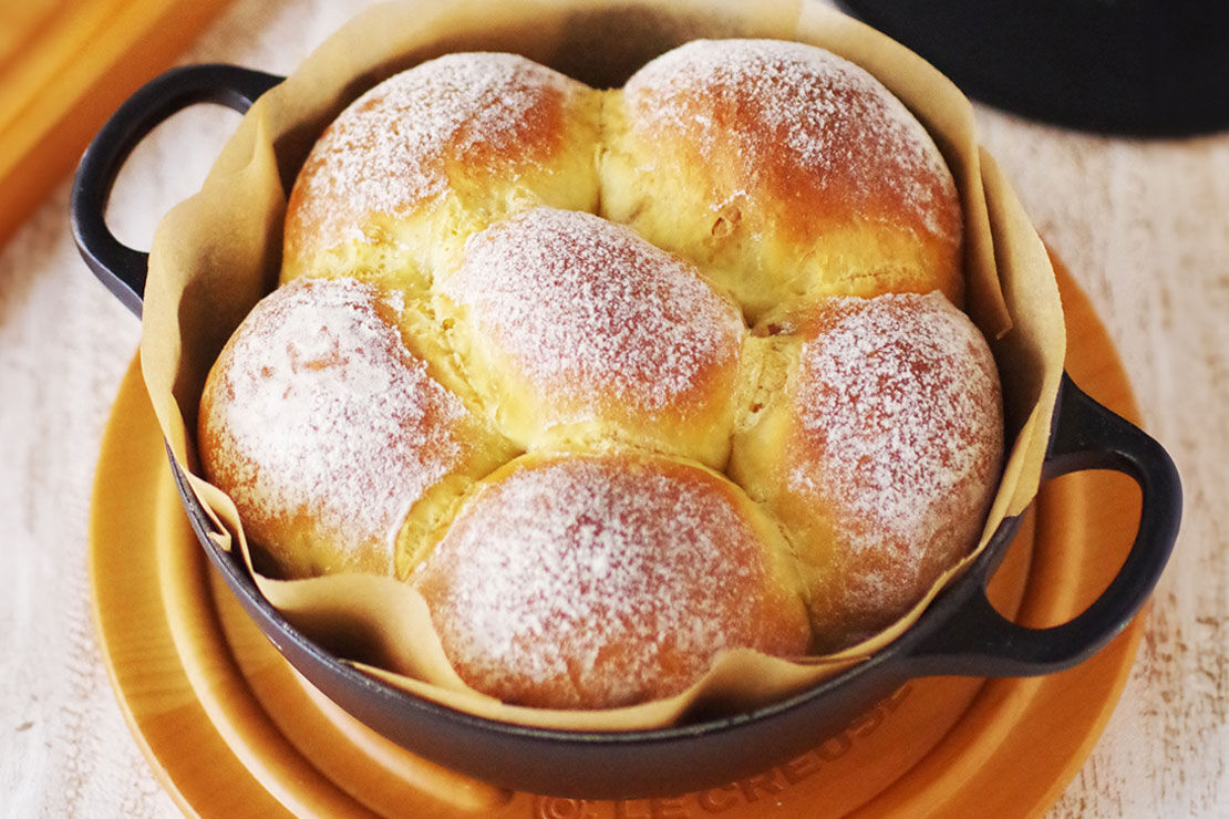 マルミットの鍋は鍋底の丸みによって熱が均等に行き渡り、中にもしっかり火が通るのでパン作りも得意。紅茶の風味豊かなミルクティーパンをしっとりふっくら仕上げます。
