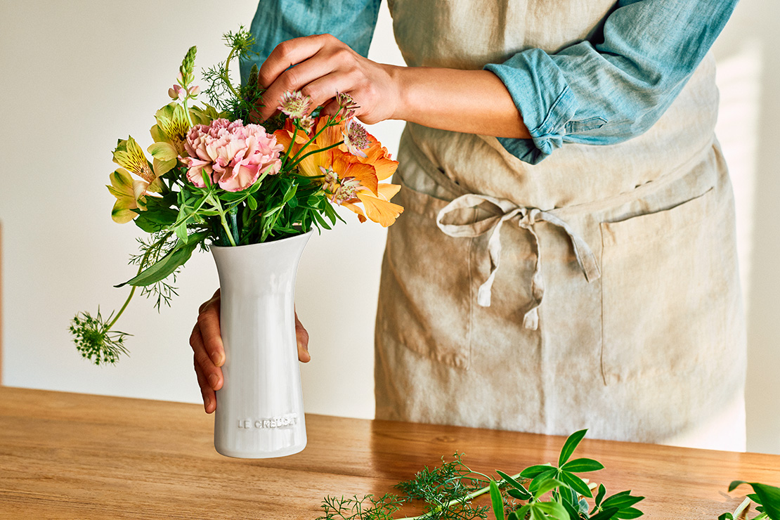 ケーキを仕上げているあいだ、彼はお花を花瓶に生けている。