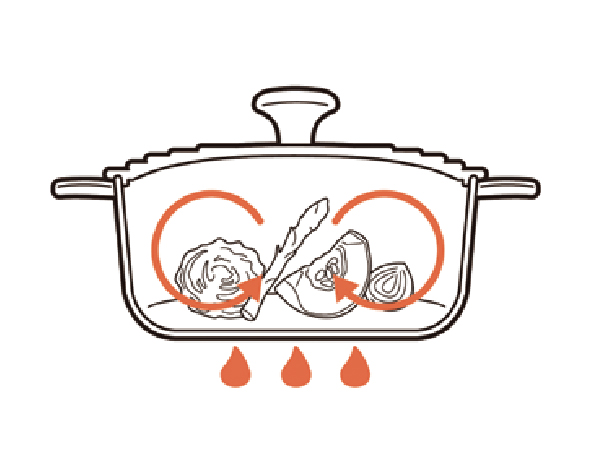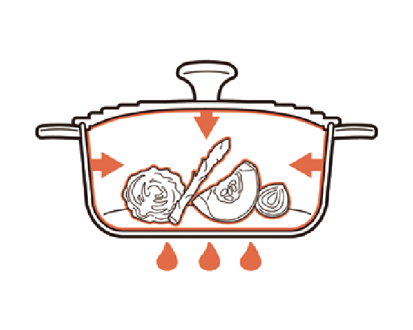 丸みを帯びたドーム型のフタが熱と蒸気の対流を起こし、食材に熱が均一に加わるため、ル・クルーゼならではのおいしさを引き出します。