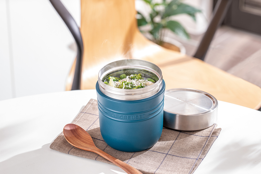 真空断熱二重壁構造の保温・保冷効果により、時間が経ってもスープをおいしくいただけます。鋳物ホーロー鍋で作った旨みたっぷりのスープをいれて、ランチやピクニックのお供としてご活用ください。