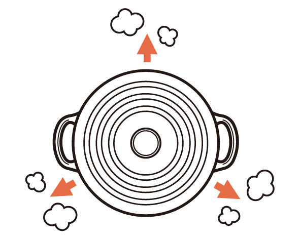 フタの3カ所にある突起からうまれる隙間から、ゆっくり均一に蒸気が抜けることで、旨みが凝縮されます。また、蒸気が適度に抜けることにより、吹きこぼれしにくい安全設計です。